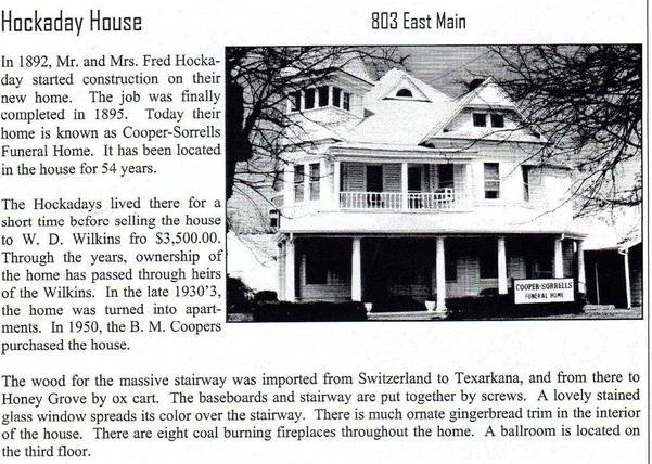 This home was begun by Mr. and Mrs. Fred Hockaday in 1892 and completed in 1895. The Hockadays lived there for a short time before selling the house to W. D. Wilkins. Through the years ownership of the home passed through heirs of the Wilkins. In the late 1930's the home was turned into apartments. In 1950, B. M. Coopers purchased the house. Today it is the Cooper-Sorrells Funeral Home. Over the years the gingerbread on the porch was removed.