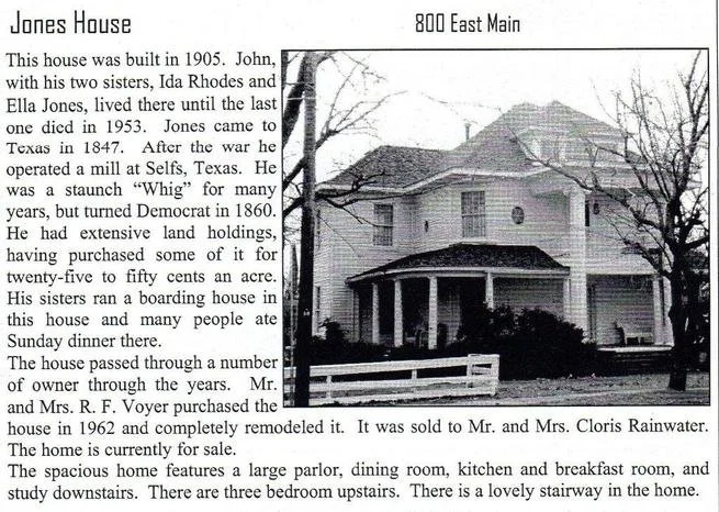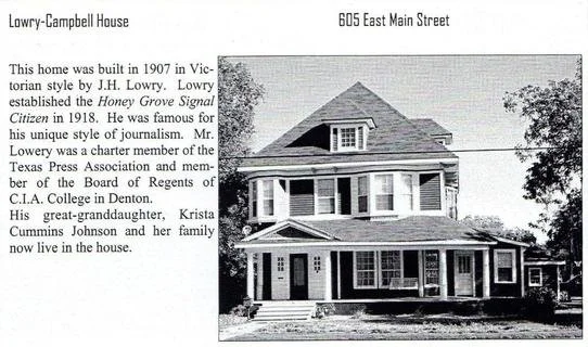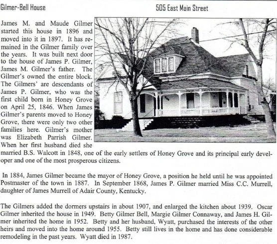 This house was built in the Gothic Revival style by James P. Gilmer (the first baby born in Honey Grove in 1846) around 1875. The Gilmers, who at one time owned most of the land on which the town is built, retained this whole lot. Miss Betty Gilmer inherited the house from her mother, Cornelia Gilmer, at her mother's death. She lived there until her death in 1954. Then the house went to Henry Dickson, who was a nephew of the Gilmers and who the Gilmers had raised. John Dickson inherited the house when his father died in 1970. Ina Peal and Jack Cobb Luttrell lived in the house from 1968-1972. John and Louise Dickson sold the house to Max Covington in 1972. The house burned in the 2010s and was demolished.