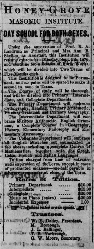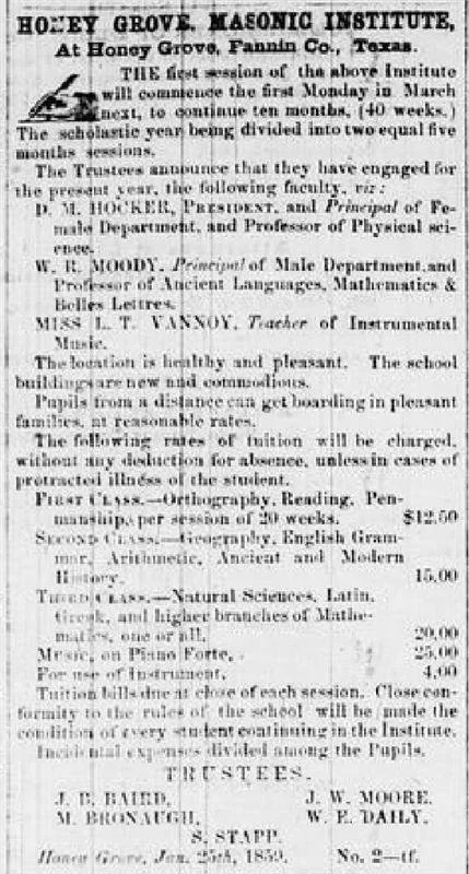 The Masonic Institute was chartered in January 1856 in Honey Grove. It met in the attic of the Smith Hotel in 1856 and 1857. In 1858 the Lodge built a two story building.
